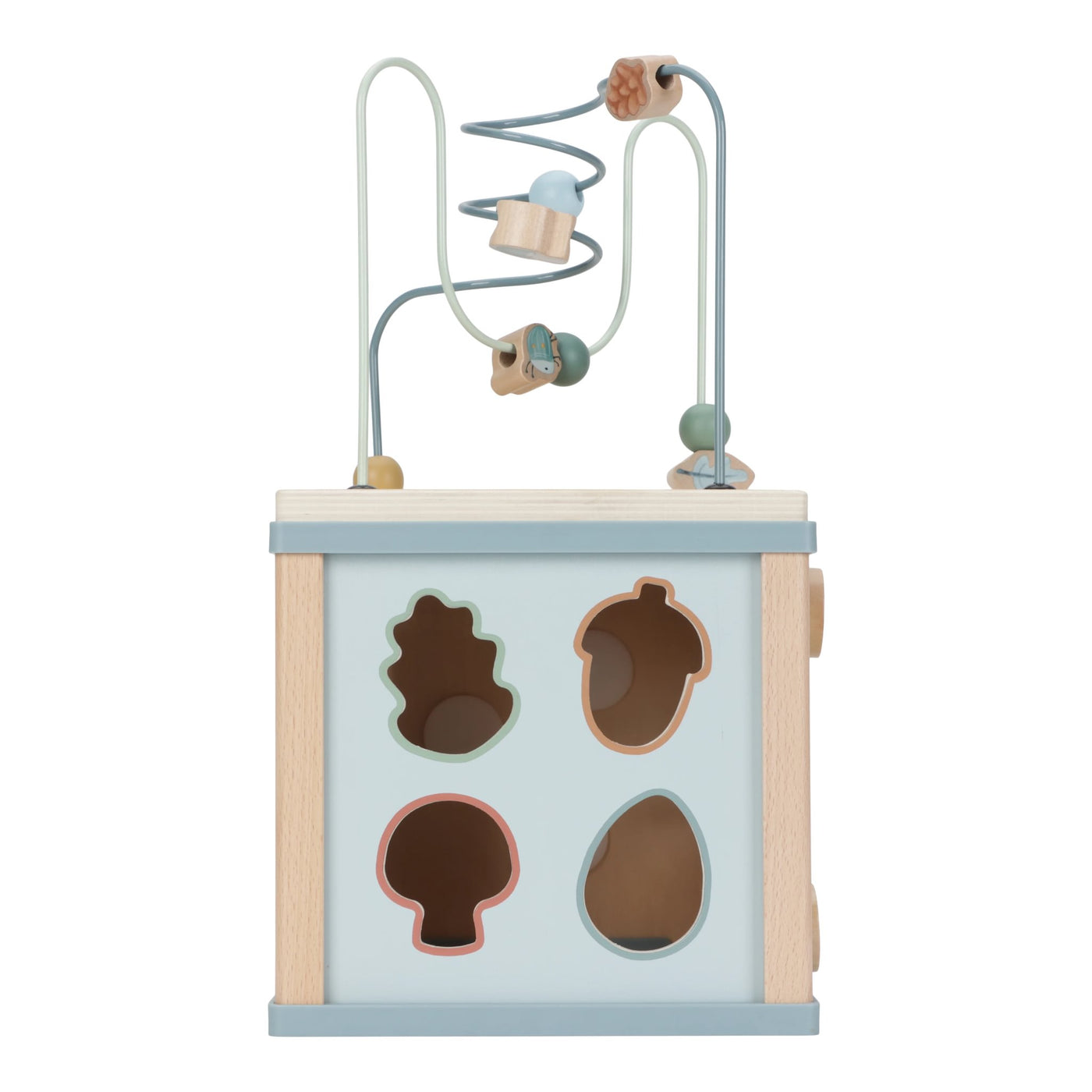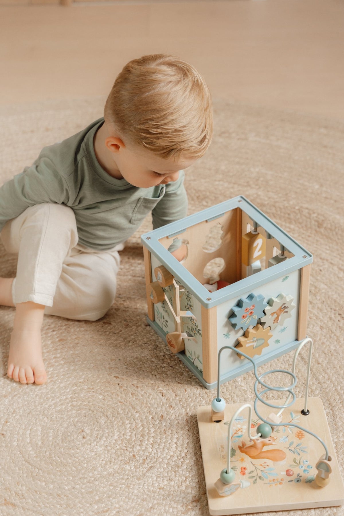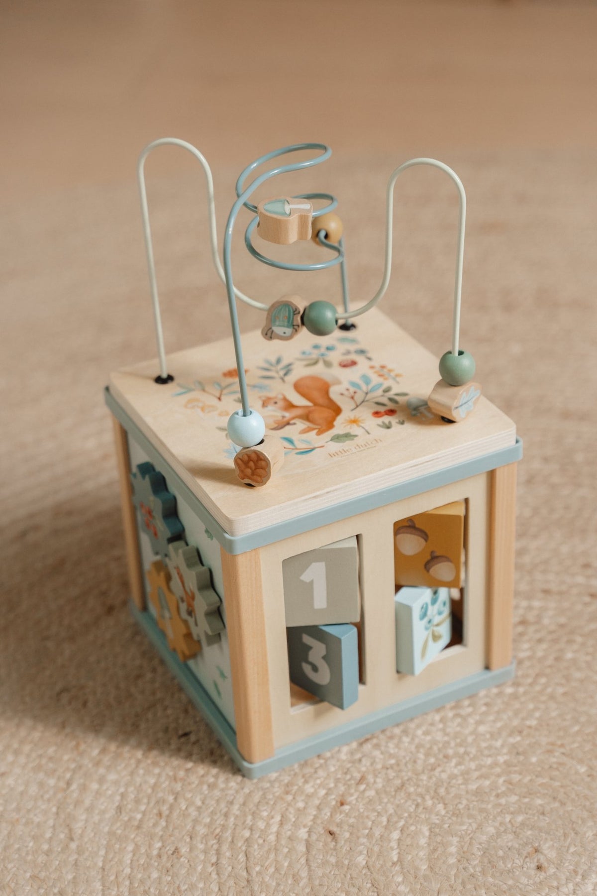Ky kub aktiviteti ofron lojëra të ndryshme që ndihmojnë në zhvillimin motorik dhe koordinimin dorë–sy të fëmijës.